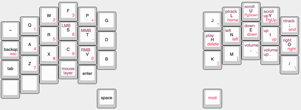 Pod moim prawym kciukiem, znajduje się klawisz opisany jako “mod”. W momencie kiedy go trzymam, pod palcami mojej prawej ręki mam klawisze strzałek, jak i inne klawisze ułatwiające nawigację. Dosłownie wbudowałem w moją klawiaturę movement vima i działa on niezależnie czy korzystam z VSC, przeglądarki, macOSa czy GNU/linuxa. To tylko jeden z przykładów, aby rozbudzić Twoją ciekawość dodam, że w podobny sposób mogę poruszać kursorem, kontrolować spotify, etc.